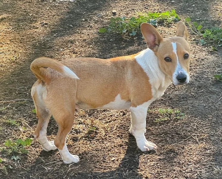 Monty was picked up as a stray in a small town near Fresno. He originally had rescue, but the rescue never made any arrangements to get him. Since he was running out of time, we were then asked to take him. We said yes although we think he is not at all dachshund and that he is a corgi mix. He has a corgi's coloring and ears. He has big paws with turned out front feet. He loves to lay in a Corgi "sploot". ( lying on belly with both back legs straight out behind). Whatever his genetic background, he is an adorable dog.