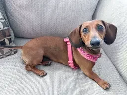 .She is a compact hot dog with the most adorable widows peak coloring. She would like a furry and/or human playmate. Currently, she spends her days playing with a young resident dog. The two will play for hours. Hazel also enjoys destuffing toys. She gets along well with the cat as well as the other dogs in the home.